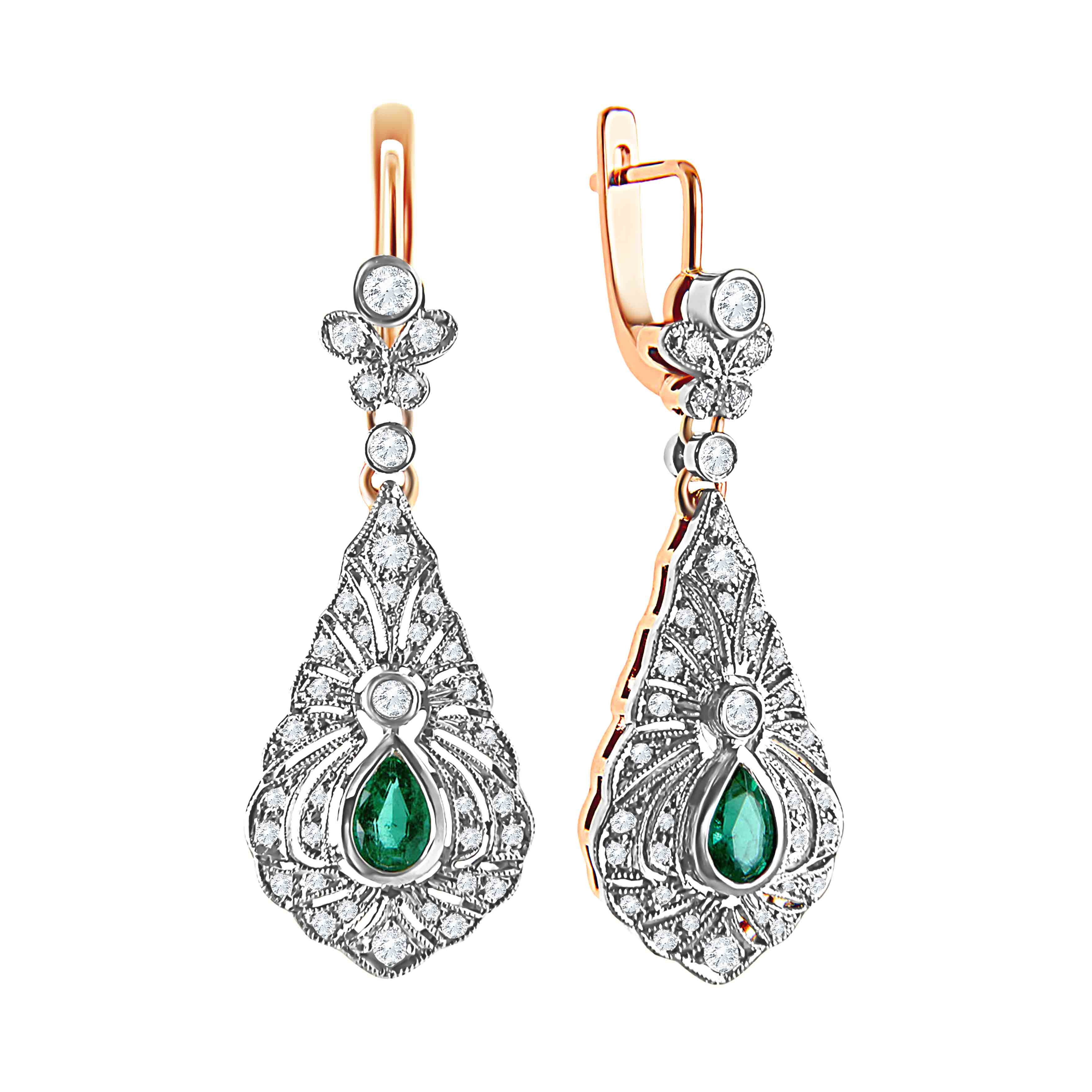 These precious, glittering handmade 585 rose and white gold earrings have real red carpet potential. Their deep-green emerald centerpieces capture the light and flatter the face of the wearer. The pear-shaped gemstones are framed by 74 round diamonds. It took a talented master jeweler over 300 hours to produce this masterpiece.